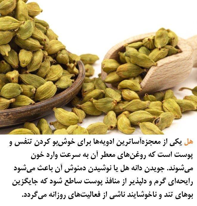 Cardamom is one of the most miraculous spices for sweetening breath and skin, as its aromatic oils enter the blood very quickly. Chewing cardamom seeds or drinking its infusion causes a warm and pleasant aroma to emanate from the pores of the skin, replacing the sharp and unpleasant odors caused by daily activities.