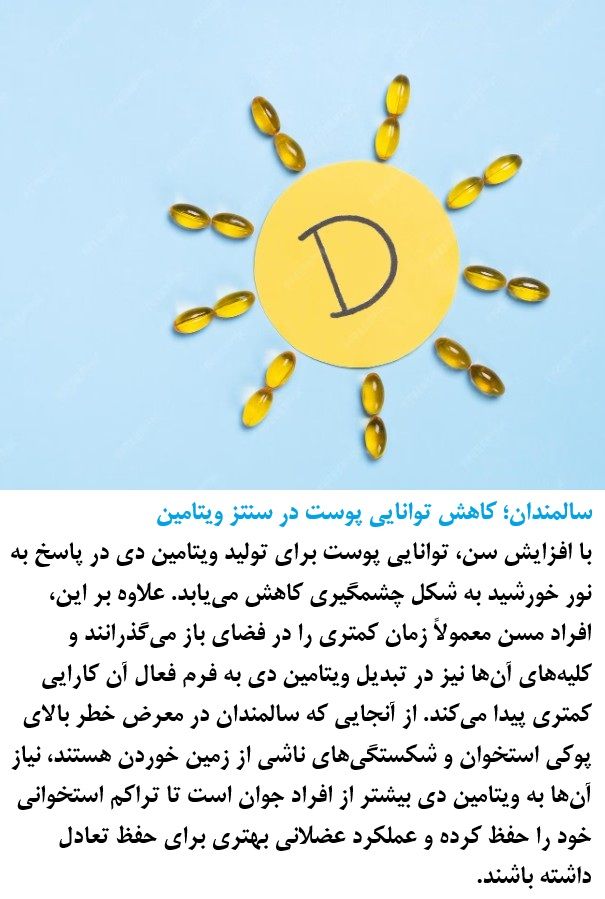 As people age, the skin's ability to synthesize Vitamin D in response to sunlight decreases significantly. Additionally, older adults often spend less time outdoors, and their kidneys become less efficient at converting Vitamin D into its active form. Because seniors are at a high risk for osteoporosis and fractures resulting from falls, their need for Vitamin D is higher than that of younger individuals to maintain bone density and ensure better muscular coordination for balance.