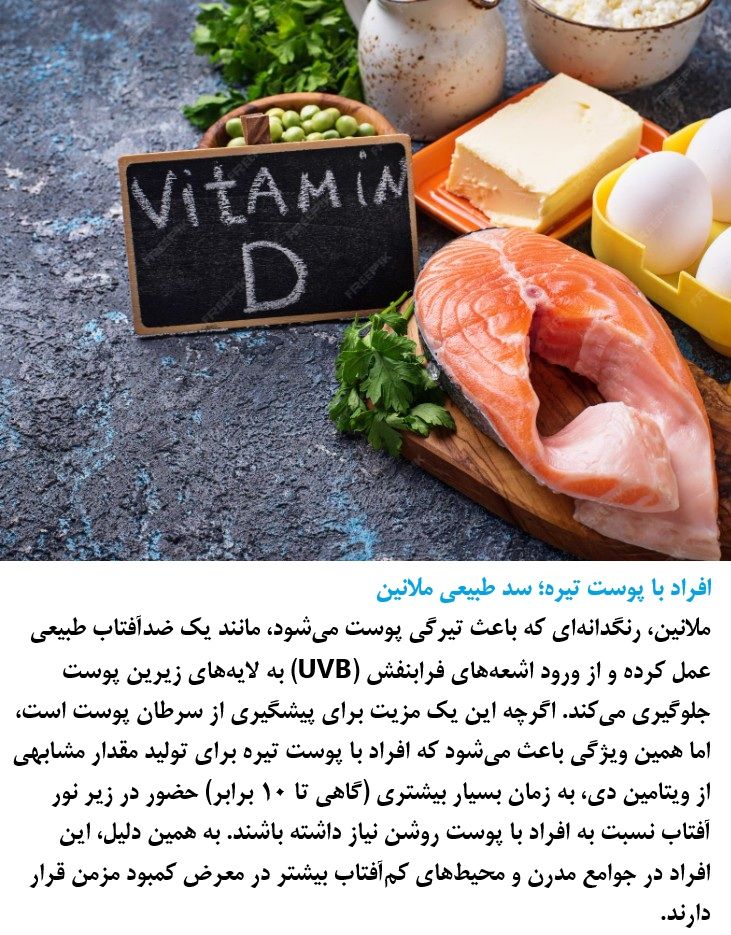 Melanin, the pigment responsible for darker skin tones, acts as a natural sunscreen by blocking ultraviolet (UVB) rays from entering the deeper layers of the skin. While this is an advantage for preventing skin cancer, it means that individuals with darker skin require much more time—sometimes up to ten times longer—under the sun to produce the same amount of Vitamin D as those with lighter skin. Consequently, these individuals are more prone to chronic deficiency in modern, indoor-centric societies or less sunny climates. 2025 © RayanWorld.com