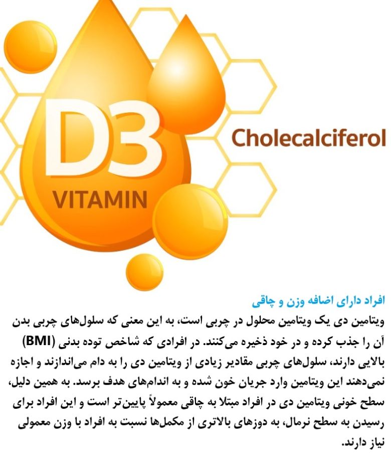 Vitamin D is a fat-soluble vitamin, meaning the body's fat cells absorb and store it. In individuals with a high Body Mass Index (BMI), fat cells "trap" large amounts of Vitamin D, preventing it from entering the bloodstream to reach target organs. Because of this, blood levels of Vitamin D in people with obesity are typically lower, and these individuals often require higher doses of supplements compared to people with a normal weight to achieve healthy blood levels. 2025 © RayanWorld.com