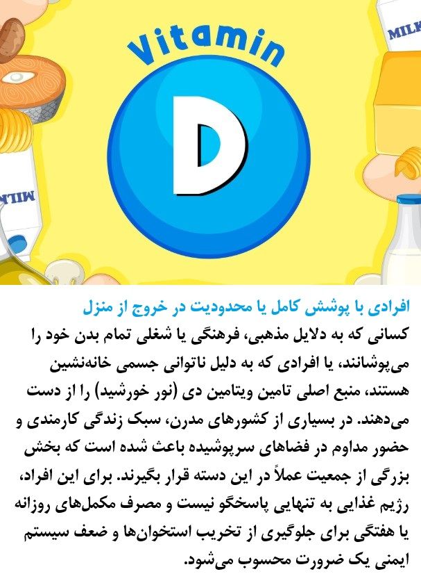 Those who cover their entire bodies for religious, cultural, or occupational reasons, as well as individuals who are homebound due to physical disabilities, lose the primary source of Vitamin D: sunlight. In many modern countries, the office-based lifestyle and constant presence in indoor spaces have placed a large portion of the population into this category. For these individuals, diet alone is rarely sufficient, and daily or weekly supplements are a necessity to prevent bone degradation and immune system weakness. 2025 © RayanWorld.com