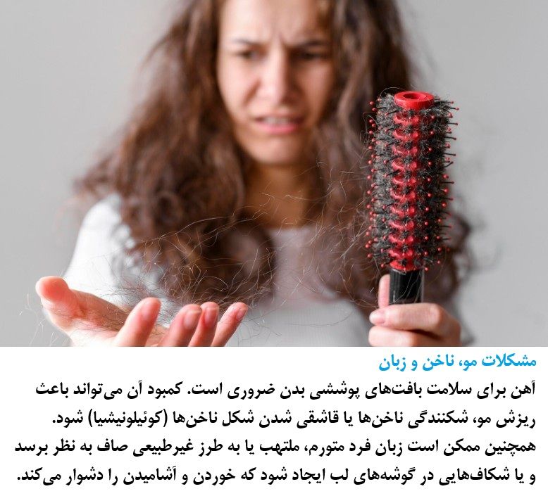 Iron is essential for the health of the body's epithelial tissues. A deficiency can cause hair loss, brittle nails, or spoon-shaped nails (koilonychia). Additionally, the tongue may appear swollen, inflamed, or unnaturally smooth, and cracks may develop at the corners of the mouth, making eating and drinking difficult.