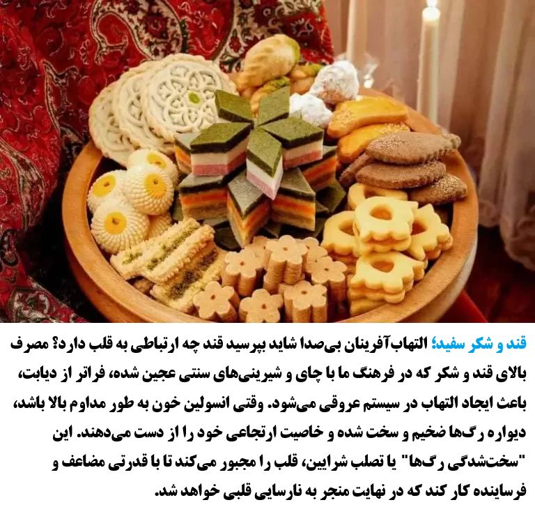White Sugar: The Silent Inflamers You might ask, what does sugar have to do with the heart? High consumption of sugar, often paired with tea and traditional sweets in our culture, goes beyond causing diabetes; it creates inflammation in the vascular system. When blood insulin is constantly high, artery walls become thick and hard, losing their elasticity. This "hardening of the arteries" or atherosclerosis forces the heart to work with double, erosive power, eventually leading to heart failure. 2026 © RayanWorld.com