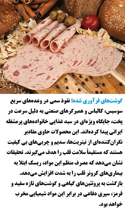 Processed Meats: Toxic Infiltration in Quick Meals Sausages, cold cuts, and industrial burgers have found a special place in the food baskets of busy Iranian families due to their cooking speed. These products contain alarming amounts of nitrites, sodium, and low-quality fats that directly target heart health. Research shows that regular consumption of these items significantly increases the risk of coronary heart disease. Returning to plant-based proteins and fresh white or red meats serves as a defensive shield against these destructive chemicals. 2026 © RayanWorld.com