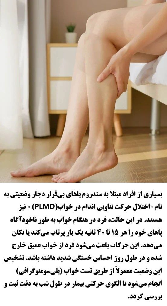 Many people with Restless Legs Syndrome also suffer from a condition called "Periodic Limb Movement Disorder" (PLMD). In this state, the person involuntarily kicks or moves their legs every 15 to 40 seconds during sleep. These movements cause the individual to transition out of deep sleep, resulting in extreme fatigue during the day. Diagnosis of this condition is usually done through a sleep study (polysomnography) to accurately record and analyze the patient's movement patterns throughout the night.