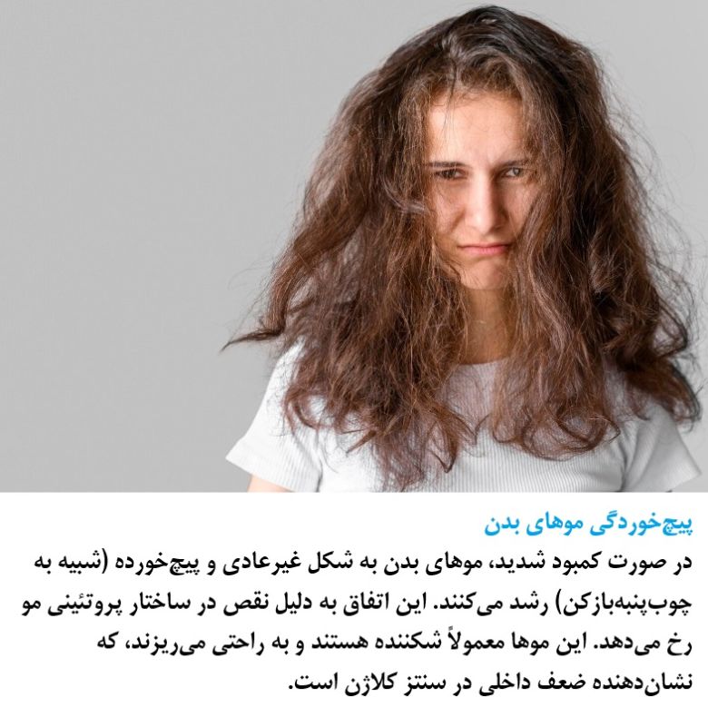 In cases of severe deficiency, body hair grows in abnormal, twisted shapes (resembling a corkscrew). This happens due to defects in the hair's protein structure. These hairs are usually brittle and fall out easily, indicating an internal weakness in collagen synthesis.