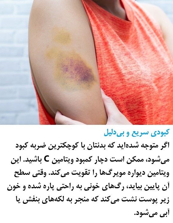 If you notice your body bruises with the slightest impact, you might be deficient in Vitamin C. This vitamin strengthens capillary walls. When levels drop, blood vessels rupture easily, leaking blood under the skin and resulting in purple or blue spots.