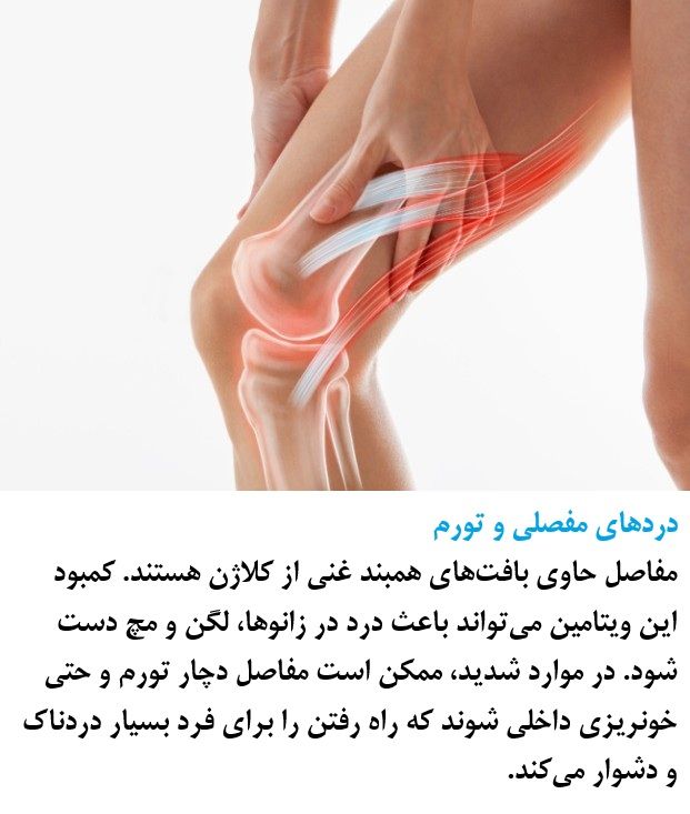 Joints contain connective tissues rich in collagen. A lack of this vitamin can cause pain in the knees, hips, and wrists. In severe cases, joints may swell or even suffer internal bleeding, making walking extremely painful and difficult for the individual.