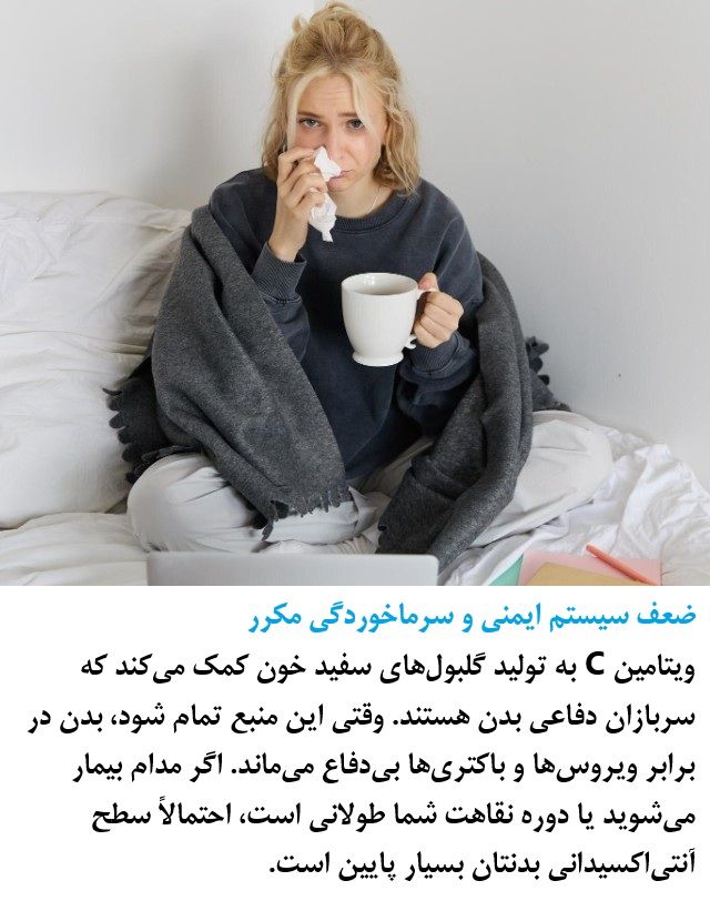 Vitamin C helps produce white blood cells, which are the body's defense soldiers. When this resource is depleted, the body becomes defenseless against viruses and bacteria. If you are constantly getting sick or your recovery period is long, your antioxidant levels are likely very low.