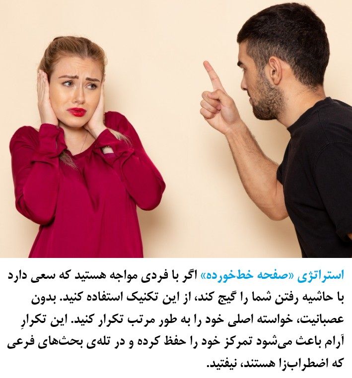 6. The "Broken Record" Strategy If you are dealing with someone who tries to confuse you by bringing up irrelevant side issues, use this technique. Without getting angry, calmly repeat your main request over and over. This calm repetition keeps you focused on your goal and prevents you from falling into the trap of anxiety-inducing side arguments.