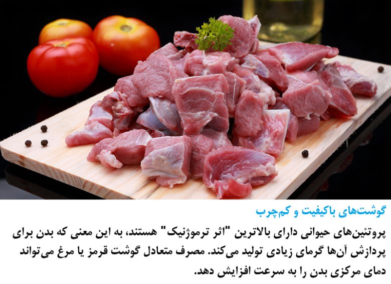 Quality Lean Meats Animal proteins have the highest "thermogenic effect," meaning the body generates significant heat to process them. Balanced consumption of red meat or poultry can quickly increase the body's core temperature.